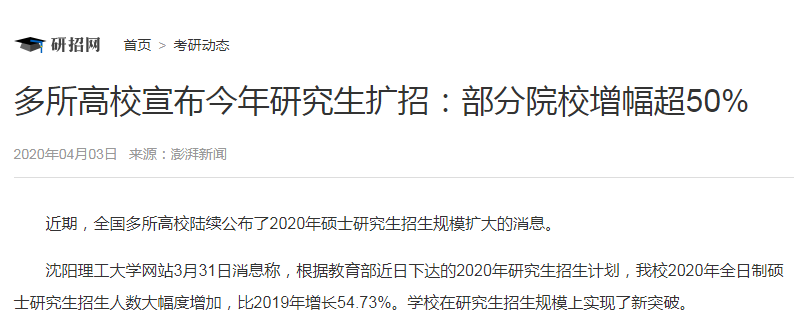 就在這樣不景氣的階段里,研招網(wǎng)發(fā)布了研究生擴招近50%的消息打破了大學生和在職人員的焦慮,讓很多迷茫的看到了機會。