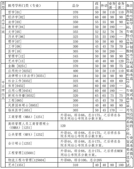(2)“少數(shù)民族高層次骨干人才計劃”(不含新疆MPA項目):同時滿足滿分100分科目單科成績不低于40分;滿分150分科目單科成績不低于70分;滿分200分科目單科成績不低于107分;滿分300分科目單科成績不低于140分;總分滿分300分考生總分不低于195分;總分滿分500分考生中,理工醫(yī)考生(報考專業(yè)代碼前兩位為“07”、“08”或“10”)要求總分不低于270分,非理工醫(yī)考生總分不低于320分?;蛘咭罁?jù)所報考院系(專業(yè))復(fù)試分?jǐn)?shù)線,總分線降10分,單科線不降。兩項分?jǐn)?shù)政策不可同時享受。