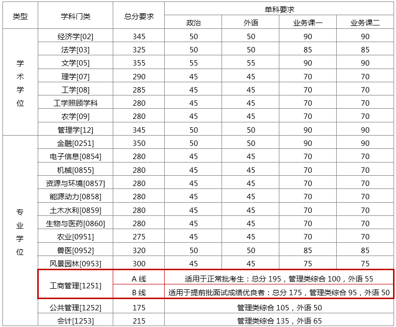 說明:上表為我?;緩?fù)試分?jǐn)?shù)要求,生源充裕學(xué)院可根據(jù)整體考試情況、招生計(jì)劃、學(xué)科專業(yè)特點(diǎn)等,上調(diào)分?jǐn)?shù)要求,但差額復(fù)試比例一般不得低于120%。報(bào)考該類學(xué)院的考生須達(dá)到學(xué)院公布的復(fù)試分?jǐn)?shù)要求才能參加復(fù)試。