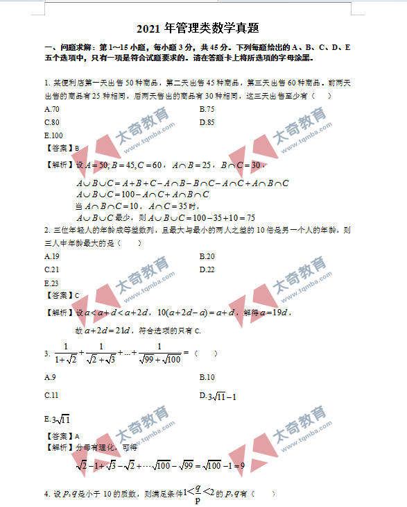 2021年MBA管理類聯(lián)考數(shù)學(xué)真題答案及解析