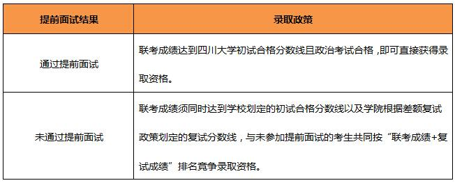 復(fù)試包括常規(guī)面試和政治考試,通過提前面試的考生參加政治考試合格則直接獲得錄取資格;未通過提前面試及未參加提前面試的考生參加政治考試合格后按照“聯(lián)考成績+面試成績”排名競爭錄取資格。