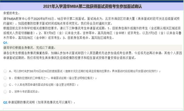 2021年清華MBA的日程安排(材料截止及面試時間)和往年相比差別不大,但第一批面試6月份的時候北京疫情形勢不太樂觀,所以面試時間都延后了,故第一批材料通過,需要面試的同學(xué)們都被迫在第二批面試時候選擇第二或者后三四批次來面試。