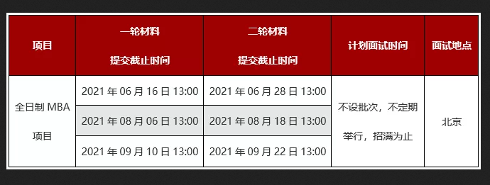 2022年全日制MBA項目的一輪材料提交最終截止時間為2021年09月10日13:00,二輪材料提交最終截止時間為2021年09月22日13:00,申請人必須在此之前在線填寫材料,檢查無誤后直接在線提交。