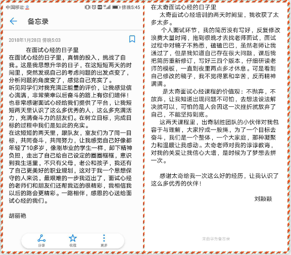隨著太奇面試輔導(dǎo)不斷進(jìn)行,同學(xué)們的參與感也愈發(fā)強(qiáng)烈,從最初清晰自己職業(yè)規(guī)劃,到后面的案例討論小組對(duì)抗、材料撰寫(xiě)現(xiàn)場(chǎng)點(diǎn)評(píng),再到最后的自我介紹現(xiàn)場(chǎng)驗(yàn)收。182期所有參營(yíng)面試學(xué)員一起認(rèn)真活動(dòng),全力以赴的對(duì)待每一個(gè)環(huán)節(jié),不斷的突破學(xué)習(xí)、積累經(jīng)驗(yàn)和開(kāi)闊視野。共享過(guò)程用心體會(huì),有歡歌笑語(yǔ)也有智慧對(duì)沖,真實(shí)的做到突破自我追求卓越。