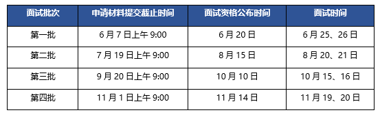 ②填寫(xiě)和上傳申請(qǐng)材料。網(wǎng)上提交的申請(qǐng)材料包括:申請(qǐng)書(shū)、成績(jī)單、個(gè)人簡(jiǎn)歷、單位組織結(jié)構(gòu)圖、推薦信(非必需)。申請(qǐng)材料的具體內(nèi)容和要求見(jiàn)系統(tǒng)內(nèi)說(shuō)明??忌峤簧暾?qǐng)材料時(shí)需要選擇申請(qǐng)面試批次,并在所選批次申請(qǐng)材料提交截止日期前提交。各批次的申請(qǐng)截止時(shí)間和面試時(shí)間見(jiàn)下頁(yè)"面試批次"表。